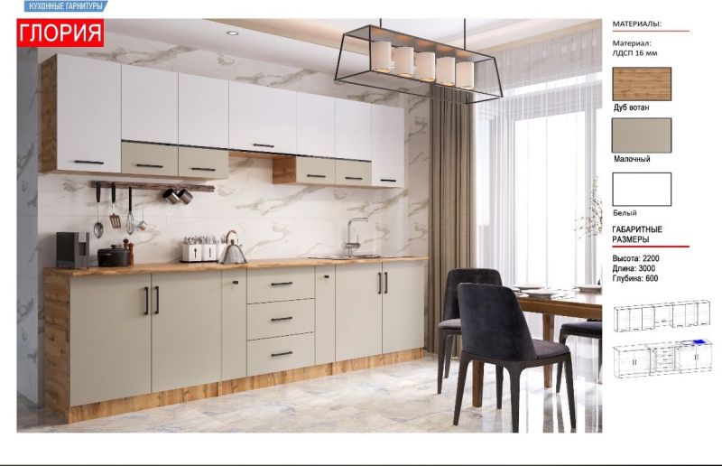 | Описание: | Тип: прямая Материал: ЛДСП Цвет: Дуб вотан/Белый/Капучино Ширина гарнитура, см:300 Глубина гарнитура, см: 60 Высота гарнитура, см: 220 Страна: Казахстан С мойкой |