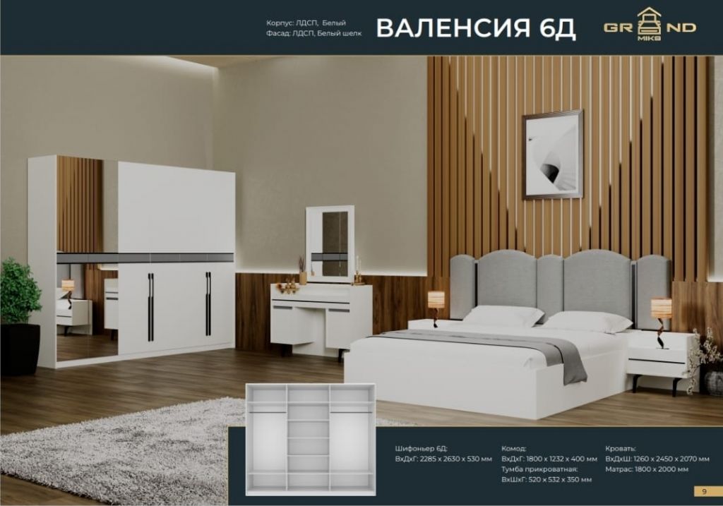 | Описание: | Спальный гарнитур "Валенсия 6Д" Белый/Белый Шелк представляет собой тщательно продуманную комбинацию предметов мебели, созданную для обеспечения максимального комфорта и функциональности в спальне. Шкаф 6Д (ВхДхГ, мм): 2285х2630х530 мм Кровать 1800: 1260*2450*2070 Спальное место: 1800х2000 мм Комод (ВхДхГ, мм): 1800х1232х400 мм Тумба прикроватная (ВхШхГ, мм): 520х532х350 мм Корпус: ЛДСП, Белый Фасад: ЛДСП, Белый Шелк Матрац в комплекте: нет |