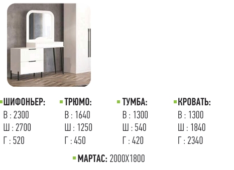 | Описание: | Внимание: Матрас (1800*2000), не входит в состав данного товара, и приобретается отдельно! Шкаф: (Ш/В/Г) 270х230х52 см Тумба: (Ш/В/Г) 54х130х42 см Трюмо: (Ш/В/Г) 125х164х45см Кровать: (Ш/В/Г) 184х130х234 см Спальное место: 180х200 см Количество предметов в наборе: 5 шт Цвет: Белый Страна: Казахстан Основной материал: ЛДСП Комплектация: зеркало, комод, тумба прикроватная, шкаф, крова |